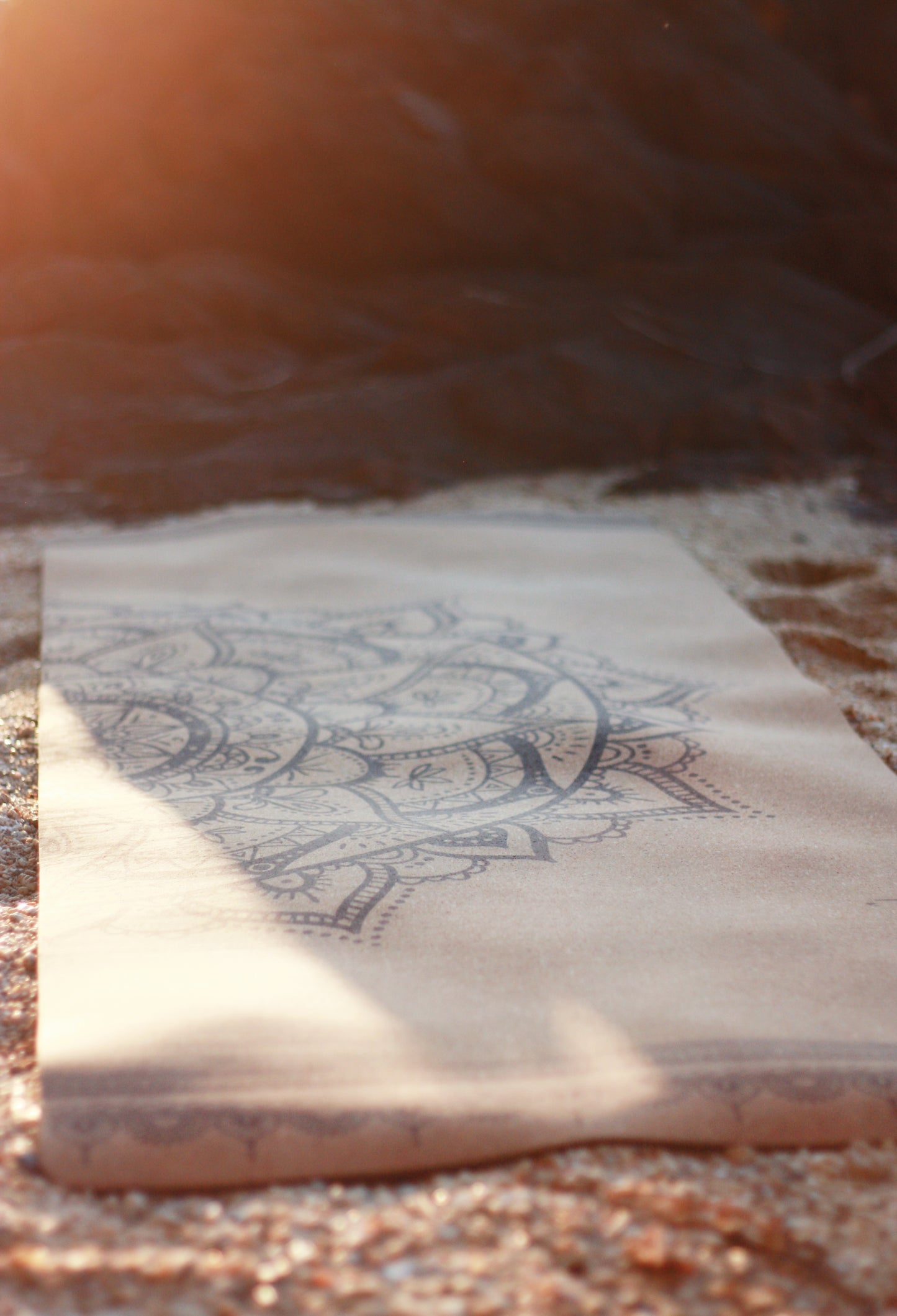 The mandala symbol is in its intricate design made to be visually appealing in order to preoccupy our analytical mind. By doing so, it gives our creative mind room to run free and in turn opens a path for higher consciousness. We created this yoga mat with one of our favorite mandalas, though we halved it to better fit and keep that hypnotic effect.